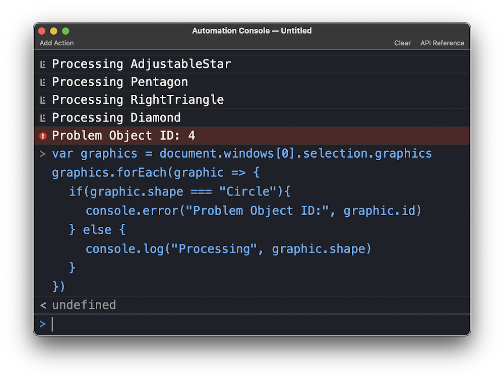 console.clear()var cnvs = document.windows[0].selection.canvasvar cnvsName = cnvs.namecnvs.graphics.forEach(function(graphic, index){var obj = new Object()obj.canvasName = cnvsNameobj.layerName = graphic.layer.nameobj.name = graphic.nameobj.id = graphic.idobj.type = graphic instanceof Line ? "Line" : graphic.shapeif (obj.type != "Line"){obj.image = graphic.image instanceof ImageReference ? true : false} else {obj.image = false}obj.locked = graphic.lockedobj.prints = graphic.layer.printsvar objStr = JSON.stringify(obj)if (obj.prints === false){console.warn("Non-Printing Graphic " + String(index),objStr)} else if (obj.name === null){console.warn("Unnamed Graphic " + String(index),objStr)} else {console.info("Graphic " + String(index),objStr)}})