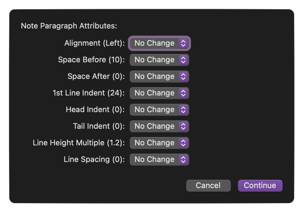 (async () => {try {console.log("DEVICE TYPE:", Device.current.type)var sel = document.windows[0].selectionitems = sel.databaseObjects.filter(item => (item instanceof Project || item instanceof Task))if(items.length === 1){var item = sel.databaseObjects[0]// reveal notetree = document.windows[0].contenttree.nodeForObject(item).expandNote(false)// identify objectsnoteObj = item.noteTextvar nStyle = noteObj.style// reset local attributes values to defaults to avoid conflicts from previous stylelocalAtts = nStyle.locallyDefinedAttributesattKeys = localAtts.map(att => att.key)attKeys.forEach(thisKey => {var targetAtt = localAtts.find(att => {return att.key === thisKey})try {nStyle.set(targetAtt, targetAtt.defaultValue)}catch(err){console.error(targetAtt.key, err.message)}})// apply formattingnStyle.set(Style.Attribute.FontFamily, 'American Typewriter')nStyle.set(Style.Attribute.FontItalic, false)nStyle.set(Style.Attribute.FontWeight, 4)typeSize = (Device.current.type === DeviceType.iPhone) ? 14:18nStyle.set(Style.Attribute.FontSize, typeSize)console.log("TYPESIZE:", typeSize)nStyle.set(Style.Attribute.BackgroundColor, null)nStyle.set(Style.Attribute.FontFillColor, Color.darkGray)LHFactor = (Device.current.type === DeviceType.iPhone) ? 1.5:2nStyle.set(Style.Attribute.ParagraphLineHeightMultiple, LHFactor)console.log("LINE HEIGHT MULTIPLE:", LHFactor)nStyle.set(Style.Attribute.ParagraphSpacingBefore, 36)nStyle.set(Style.Attribute.KerningAdjustment, 1)var tailIndent = (Device.current.type === DeviceType.mac) ? 72:36if (Device.current.type === DeviceType.iPhone){nStyle.set(Style.Attribute.ParagraphTailIndent, 0)console.log("TAILINDENT:", 0)} else {nStyle.set(Style.Attribute.ParagraphTailIndent, tailIndent)console.log("TAILINDENT:", tailIndent)}} else {throw {name: "Selection Issue",message: "Please select a single project or task."}}}catch(err){new Alert(err.name, err.message).show()}})();