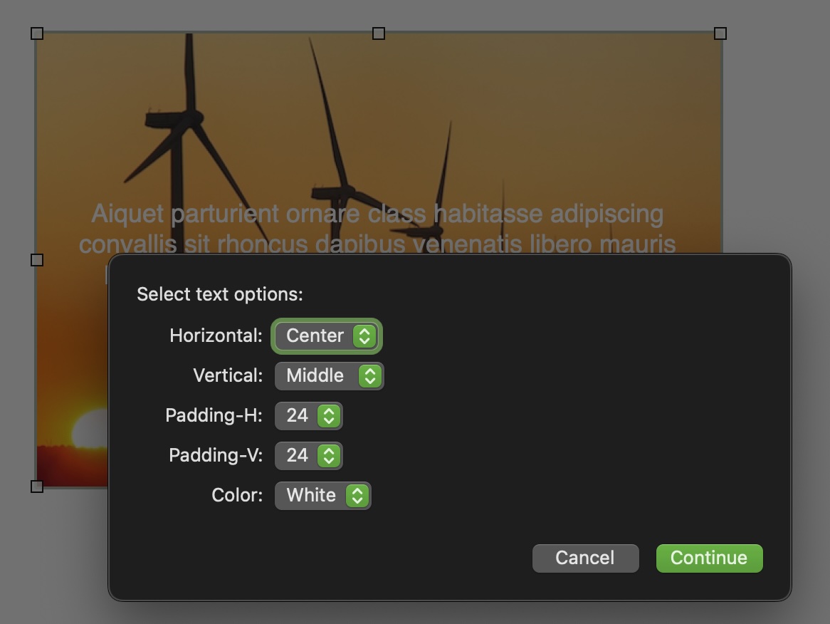 /*{"type": "action","targets": ["omnigraffle"],"author": "Otto Automator","identifier": "com.omni-automation.og.overlay-image-notes","version": "1.0","description": "WIll overlay the notes of the selected image and position the text according to selected options.","label": "Overlay Notes on Image","shortLabel": "Overlay Notes","paletteLabel": "Overlay Notes","image": "dock.arrow.down.rectangle"}*/(() => {var preferences = new Preferences() // NO ID = PLUG-IN IDconst action = new PlugIn.Action(async function(selection, sender){try {defaultTextVerticalIndex = 0defaultTextHorizontalIndex = 0defaultTextColorIndex = 0defaultTextVerticalPadding = 0defaultTextHorizontalPadding = 0textHorizontalIndex = preferences.readNumber("textHorizontalIndex")if(!textHorizontalIndex){textHorizontalIndex = defaultTextHorizontalIndex}textVerticalIndex = preferences.readNumber("textVerticalIndex")if(!textVerticalIndex){textVerticalIndex = defaultTextVerticalIndex}textColorIndex = preferences.readNumber("textColorIndex")if(!textColorIndex){textColorIndex = defaultTextColorIndex}textHorizontalPadding = preferences.readNumber("textHorizontalPadding")if(!textHorizontalPadding){textHorizontalPadding = defaultTextHorizontalPadding}textVerticalPadding = preferences.readNumber("textVerticalPadding")if(!textVerticalPadding){textVerticalPadding = defaultTextVerticalPadding}sel = document.windows[0].selectionimajShape = sel.solids[0]horizontalAlignmentMenu = new Form.Field.Option("horizontalTextAlignment","Horizontal",HorizontalTextAlignment.all,null,HorizontalTextAlignment.all[textHorizontalIndex])verticalAlignmentMenu = new Form.Field.Option("verticalTextAlignment","Vertical",VerticalTextPlacement.all,null,VerticalTextPlacement.all[textVerticalIndex])paddings = [0, 1, 2, 3, 4, 5, 6, 8, 10, 12, 14, 18, 20, 24]textHorizontalPaddingMenu = new Form.Field.Option("textHorizontalPadding","Padding-H",paddings,null,textHorizontalPadding)textVerticalPaddingMenu = new Form.Field.Option("textVerticalPadding","Padding-V",paddings,null,textVerticalPadding)textColorValues = [Color.white, Color.black]textColorMenu = new Form.Field.Option("textColorIndex","Color",[0,1],["White", "Black"],textColorIndex)inputForm = new Form()inputForm.addField(horizontalAlignmentMenu)inputForm.addField(verticalAlignmentMenu)inputForm.addField(textHorizontalPaddingMenu)inputForm.addField(textVerticalPaddingMenu)inputForm.addField(textColorMenu)formPrompt = "Select text options:"buttonTitle = "Continue"formObject = await inputForm.show(formPrompt,buttonTitle)imajShape.text = imajShape.notesverticalTextAlignment = formObject.values["verticalTextAlignment"]imajShape.textVerticalPlacement = verticalTextAlignmenttextVerticalIndex = VerticalTextPlacement.all.indexOf(verticalTextAlignment)preferences.write("textVerticalIndex", textVerticalIndex)horizontalTextAlignment = formObject.values["horizontalTextAlignment"]imajShape.textHorizontalAlignment = horizontalTextAlignmenttextHorizontalIndex = HorizontalTextAlignment.all.indexOf(horizontalTextAlignment)preferences.write("textHorizontalIndex", textHorizontalIndex)textHorizontalPadding = formObject.values["textHorizontalPadding"]imajShape.textHorizontalPadding = textHorizontalPaddingpreferences.write("textHorizontalPadding", textHorizontalPadding)textVerticalPadding = formObject.values["textVerticalPadding"]imajShape.textVerticalPadding = textVerticalPaddingpreferences.write("textVerticalPadding", textVerticalPadding)textColorIndex = formObject.values["textColorIndex"]textColorValue = textColorValues[textColorIndex]imajShape.textColor = textColorValuepreferences.write("textColorIndex", textColorIndex)}catch(err){if(!err.causedByUserCancelling){new Alert(err.name, err.message).show()}}});action.validate = function(selection, sender){sel = document.windows[0].selectionreturn (sel.solids.length === 1 &&sel.solids[0].image instanceof ImageReference &&sel.solids[0].notes.length > 0)};return action;})();