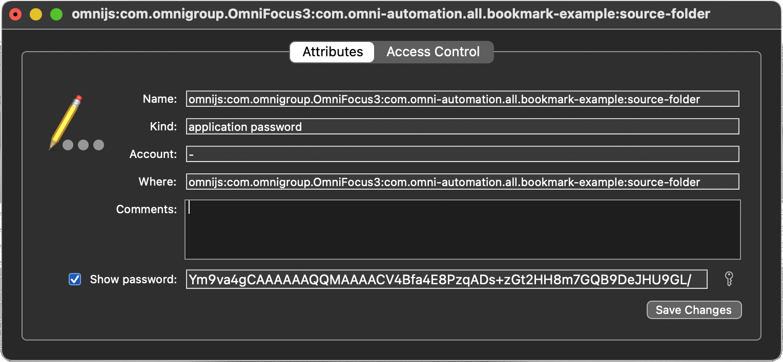 On macOS, bookmarks can be located in the Keychain Access application by filtering using the credential service title:
