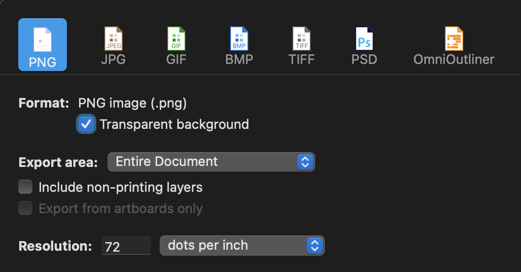 IMPORTANT: for best results, set the dimensions of the current canvas to match those of the Keynote slides. For example, if the Keynote presentation dimensions is set to “wide” (1920x1080), then set the dimensions of the canvas to match (1920x1080). Also note that the alpha transparency of the PNG images uses the current OmniGraffle export settings (see below).