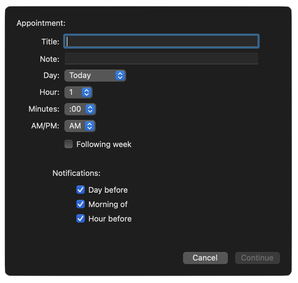 (async () => {try {function createUtterance(textToSpeak){langCode = Speech.Voice.currentLanguageCodevoiceObj = Speech.Voice.withLanguage(langCode)utterance = new Speech.Utterance(textToSpeak)utterance.voice = voiceObjutterance.rate = Speech.Utterance.defaultSpeechRatereturn utterance}synthesizer = new Speech.Synthesizer()// CREATE FORM ELEMENTSappointmentNameField = new Form.Field.String("appointmentName","Title",null,null)appointmentNoteField = new Form.Field.String("appointmentNote","Note",null,null)dayItems = ["Today", "Tomorrow", "Monday", "Tuesday", "Wednesday", "Thursday", "Friday", "Saturday", "Sunday"]dayIndexes = new Array()dayItems.forEach((item, index) => dayIndexes.push(index))dayMenu = new Form.Field.Option("dayMenu","Day",dayIndexes,dayItems,0)hourItems = ["1", "2", "3", "4", "5", "6", "7", "8", "9", "10", "11", "12"]hourIndexes = new Array()hourItems.forEach((item, index) => hourIndexes.push(index))hourMenu = new Form.Field.Option("hourMenu","Hour",hourIndexes,hourItems,0)minuteItems = [":00", ":15", ":30", ":45"]minuteIndexes = [0, 1, 2, 3]minutesMenu = new Form.Field.Option("minutesMenu","Minutes",minuteIndexes,minuteItems,0)meridianItems = ["AM", "PM"]meridianIndexes = [0, 1]meridianMenu = new Form.Field.Option("meridianMenu","AM/PM",meridianIndexes,meridianItems,0)checkSwitchField = new Form.Field.Checkbox("followingWeek","Following week",null)menuLabel = "Notifications"notificationOptionsStrings = ["Day before", "Morning of", "Hour before"]multiOptionMenu = new Form.Field.MultipleOptions("notificationsOptions",menuLabel,[0,1,2],notificationOptionsStrings,[0,1,2])// CREATE FORMinputForm = new Form()inputForm.addField(appointmentNameField)inputForm.addField(appointmentNoteField)inputForm.addField(dayMenu)inputForm.addField(hourMenu)inputForm.addField(minutesMenu)inputForm.addField(meridianMenu)inputForm.addField(checkSwitchField)inputForm.addField(multiOptionMenu)// VALIDATE FORM ENTRIESinputForm.validate = function(formObject){var appointmentName = formObject.values['appointmentName']if (!appointmentName || appointmentName.length === 0){return false}return true}// DISPLAY FORMformPrompt = "Appointment:"buttonTitle = "Continue"utterance = createUtterance("Enter the title for the appointment:")synthesizer.speakUtterance(utterance)formObject = await inputForm.show(formPrompt, buttonTitle)// RETRIEVE CHOSEN FORM VALUESdayIndex = formObject.values['dayMenu']chosenDay = dayItems[dayIndex]console.log("chosenDay", chosenDay)hourIndex = formObject.values['hourMenu']chosenHour = hourItems[hourIndex]console.log("chosenHour", chosenHour)minuteIndex = formObject.values['minutesMenu']chosenMinute = minuteItems[minuteIndex]console.log("chosenMinute", chosenMinute)meridianIndex = formObject.values['meridianMenu']chosenMeridian = meridianItems[meridianIndex]console.log("chosenMeridian", chosenMeridian)useFollowingWeek = formObject.values['followingWeek']console.log("useFollowingWeek", useFollowingWeek)timeValue = chosenHour + chosenMinute + chosenMeridianconsole.log("timeValue", timeValue)fmatr = Formatter.Date.withStyle(Formatter.Date.Style.Full, Formatter.Date.Style.Short)dateObj = fmatr.dateFromString(`${chosenDay} @ ${timeValue}`)if(useFollowingWeek){var dc = Calendar.current.dateComponentsFromDate(dateObj)dc.day = dc.day + 7dateObj = Calendar.current.dateFromDateComponents(dc)}var dateStr = fmatr.stringFromDate(dateObj)appointmentName = formObject.values['appointmentName']appointmentNote = formObject.values['appointmentNote']if (!appointmentNote){appointmentNote = ""}// CREATE NEW TASK WITH FORM DATAtask = new Task(appointmentName)task.note = appointmentNotetask.dueDate = dateObjtag = flattenedTags.byName("Appointment") || new Tag("Appointment")task.addTag(tag)notificationIndexes = formObject.values["notificationsOptions"]notificationIndexes.forEach(index => {// day before, morning of, hour beforeif(index === 0){task.addNotification(-86400)}if(index === 1){var dc = Calendar.current.dateComponentsFromDate(dateObj)dc.hour = 9 // morning hourdc.minute = 0 // morning minutevar notificationDateObj = Calendar.current.dateFromDateComponents(dc)task.addNotification(notificationDateObj)}if(index === 2){task.addNotification(-3600)}})// CONFIRMATION ALERTalertTitle = "Form Result"alertMessage = "Your appointment is for:\n\n" + dateStralert = new Alert(alertTitle, alertMessage)alert.addOption("Show")alert.addOption("OK")buttonIndex = await alert.show()if (buttonIndex === 0){var taskID = task.id.primaryKeyvar urlStr = "omnifocus://task/" + taskIDURL.fromString(urlStr).open()}utterance = createUtterance("Done!")synthesizer.speakUtterance(utterance)}catch(err){if (!err.message.includes("cancelled")){utterance = createUtterance(err.message)synthesizer.speakUtterance(utterance)//new Alert(err.name, err.message).show()}}})();